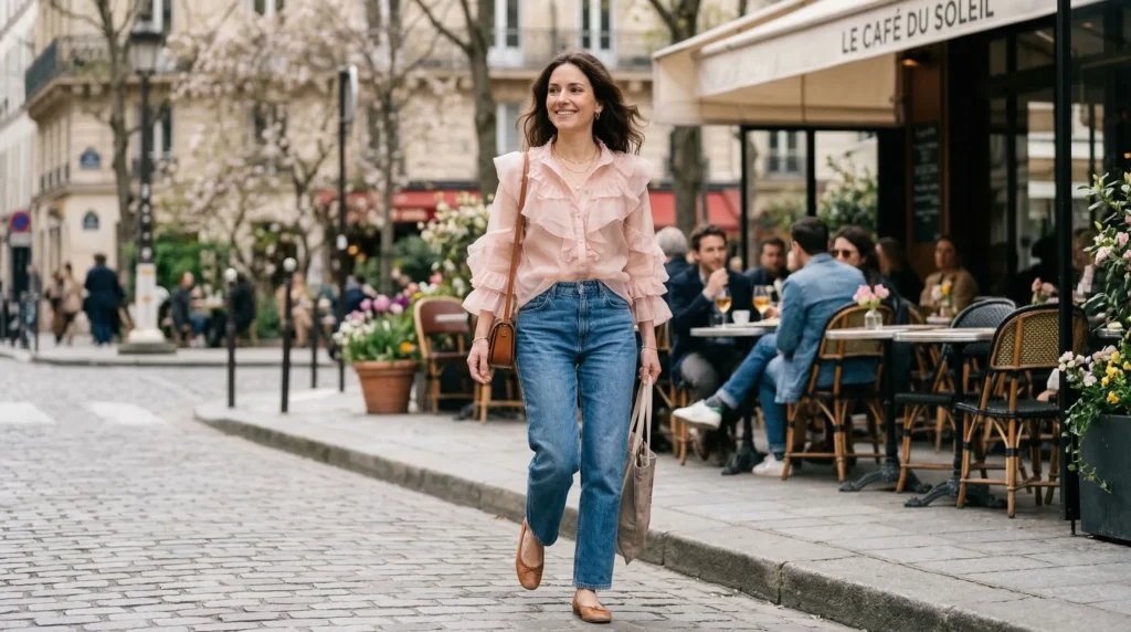 The blouse does most of the storytelling here. Its layered texture and airy fabric bring movement and femininity, while the jeans keep everything approachable and real. This is exactly the kind of pairing that defines trending spring outfits 2026 — two pieces that shouldn’t logically work together but absolutely do, because the contrast between them creates something more interesting than either piece could achieve alone.