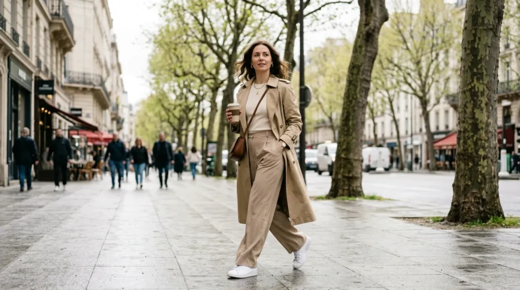 This outfit reflects the more considered, slower side of layering that’s emerging strongly in spring street style 2026. Muted tones, fluid fabrics, and comfortable footwear come together in a way that feels thoughtful and relaxed rather than trend-driven. A light structured coat over fluid trousers with sneakers is practical spring fashion that doesn’t sacrifice style — and that balance is genuinely harder to achieve than it looks.
