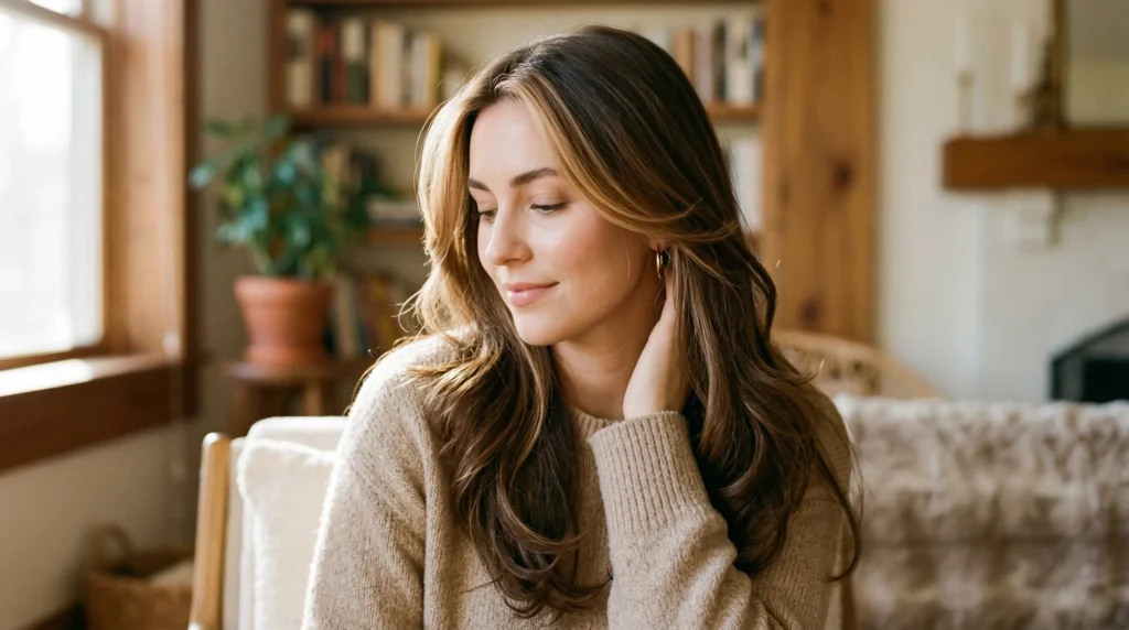 This haircut is a love letter to dimension. The base leans brunette with lighter ribbons flowing through the layers — especially toward the ends — creating that sun-touched effect without harsh contrast. Medium length, long layers that cascade rather than stack. Everything blends, nothing interrupts the flow.