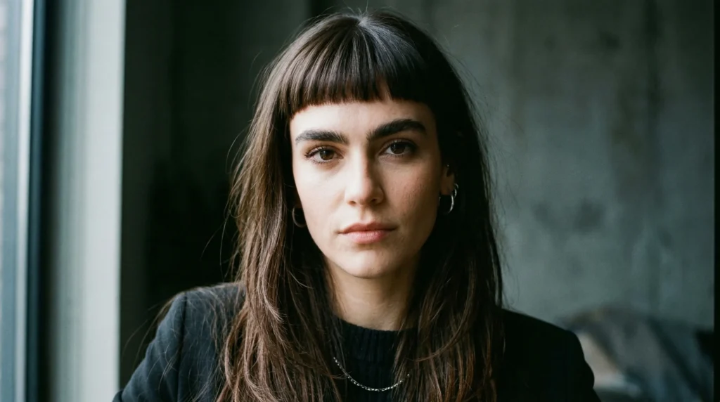 This is the fashion-forward pick of the list, and it earns its place. Long, structured layers fall smoothly over the shoulders, contrasted by bold, short micro bangs that immediately draw attention to the eyes. The silhouette is clean and deliberate — softness in the length, sharp definition at the front.