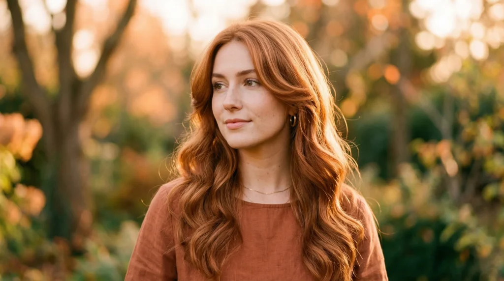 Copper continues into spring 2026, but this version feels romantic rather than bold. Generous length, face-framing layers that curve softly around the cheeks and jawline, and waves that are loose and polished rather than beachy and undone. The color leans warm and refined, catching light in a way that feels almost luminous.