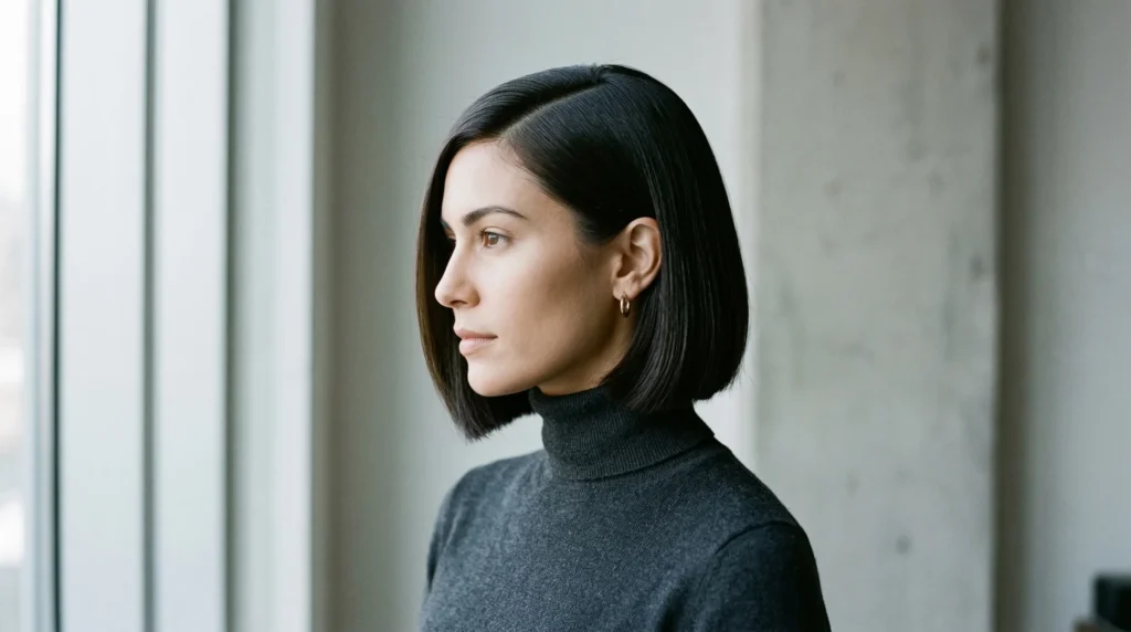 This bob is deliberate, clean, and incredibly modern. The length hits just below the jawline with precise lines that still feel soft through subtle internal layering. The deep side part adds quiet drama without tipping into severity. Minimal but never boring.