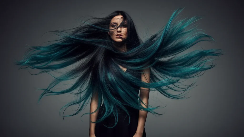 Deep black roots fading into teal tips creates an ocean-inspired gradient that’s surprisingly versatile. The teal complements most skin tones, and because it’s concentrated at the ends, you can always chop it off if you change your mind.
