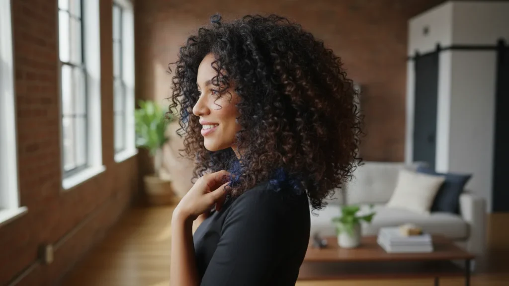Hidden blue highlights through dark brown create an unexpected pop that’s playful without being childish. The blue shows up most when hair is curled or braided, making it perfect for people who like switching between professional and fun looks.
