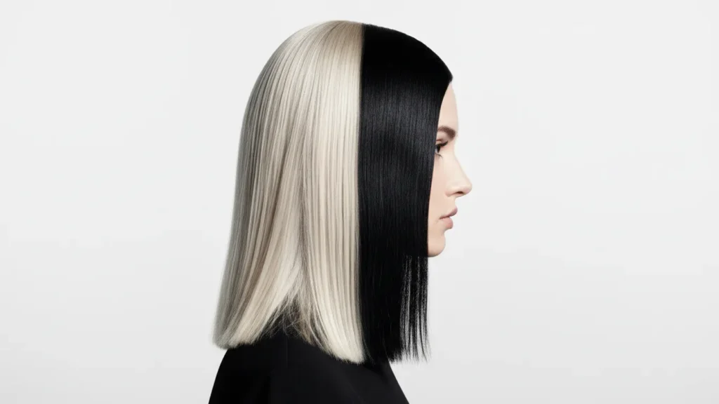The ultimate high-contrast look. One side platinum, the other jet black—it’s cartoon-like in the best way possible. Now here’s where it gets interesting: this style requires serious commitment. You’ll need regular toning for the blonde side and color-safe products to prevent fading on both.