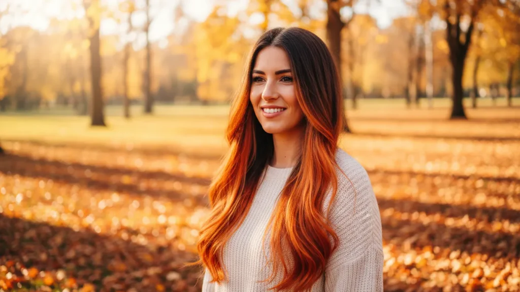 Warm orange highlights against brown or black hair create an autumn-inspired two toned hair look that’s surprisingly wearable. The key is keeping the orange concentrated around the face rather than throughout, which makes it less overwhelming.