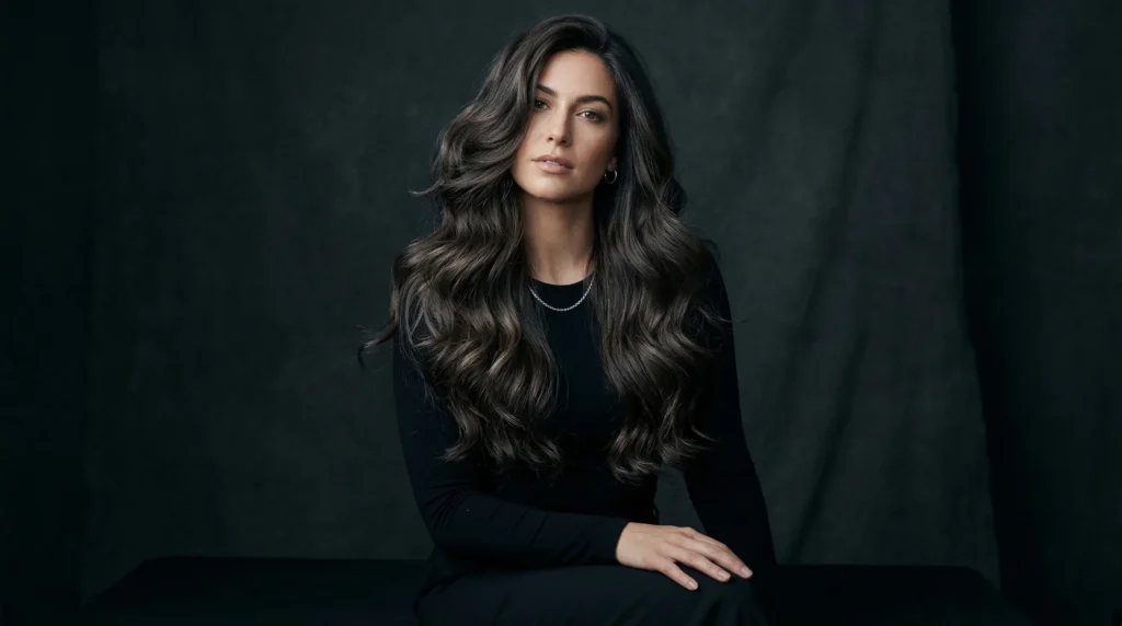 Not every spring brunette needs warmth. Sometimes you want depth — cool, smoky depth that feels sharp and intentional. Cool espresso waves deliver exactly that. The base is a deep brown with muted ash-brown dimension that creates a smoky finish. Long waves with lots of volume and feathered layers keep it from feeling heavy, even with all that depth.