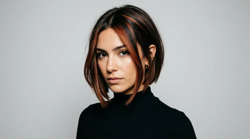 Alright — this one’s for the brave. A sharp chin-length bob with bold cinnamon and copper streaks woven through a deep brunette base. The contrast between dark brown and fiery copper creates a graphic, editorial effect that feels confident and completely current. It’s not subtle. It’s not trying to be. And that’s exactly what makes it one of the most exciting brunette balayage trends to come out of spring 2026.