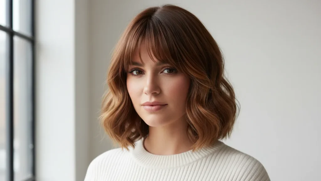 This style is soft, face-framing, and ridiculously flattering—especially if you’ve got a round or heart-shaped face. The subtle waves add movement while the bangs give you that cool, laid-back vibe.