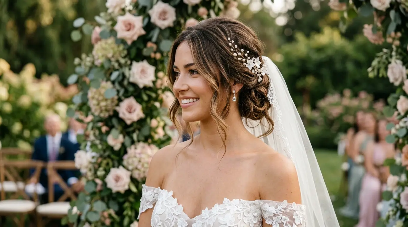 | 2 | Soft Twisted Updo with Floral Tiara | Medium–long | Open neck, fine lace | Garden, vineyard, romantic |