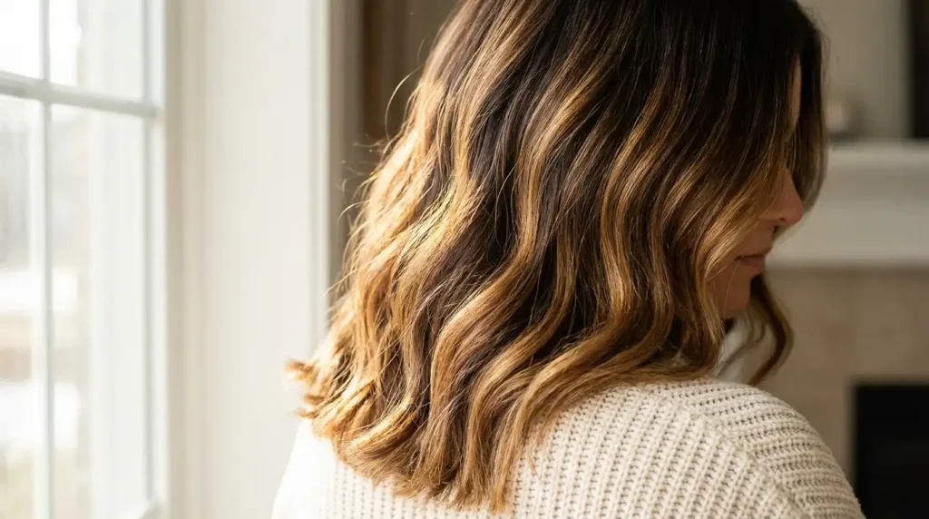 Soft caramel highlights melting into darker roots creates lived-in perfection.