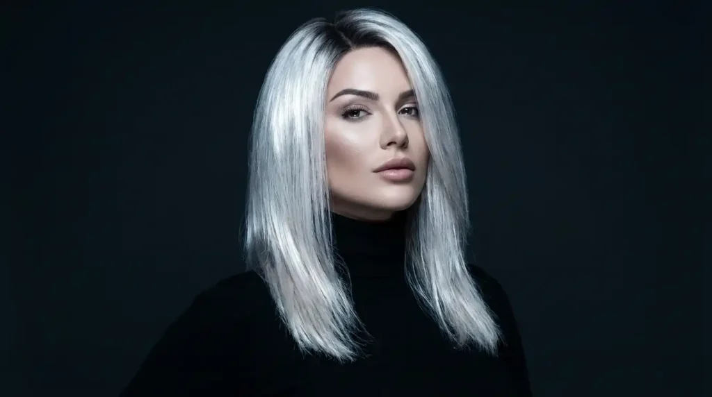 Cool platinum blonde with darker roots creates modern winter sophistication.