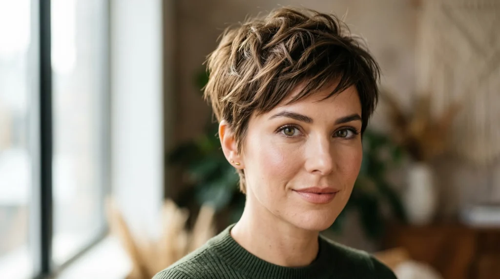 Short hair is bold, beautiful, and having a major moment. The textured pixie cut for winter 2025-2026 is all about movement and personality. This isn’t your grandmother’s pixie — it’s got choppy layers, soft edges, and a deliberately undone quality that reads as incredibly stylish.