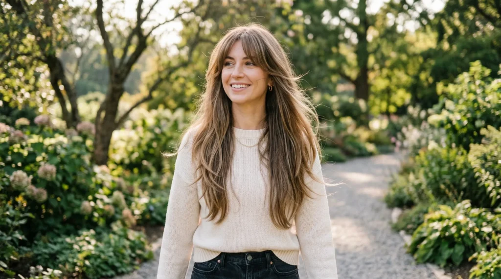 For long hair lovers, long layered cuts with curtain bangs are the dominant trend this winter. Layers add movement and prevent that heavy, limp look that long hair can develop in winter’s dry air. And curtain bangs — soft, face-framing, swept to the sides — are one of those rare trends that genuinely work for nearly every face shape.