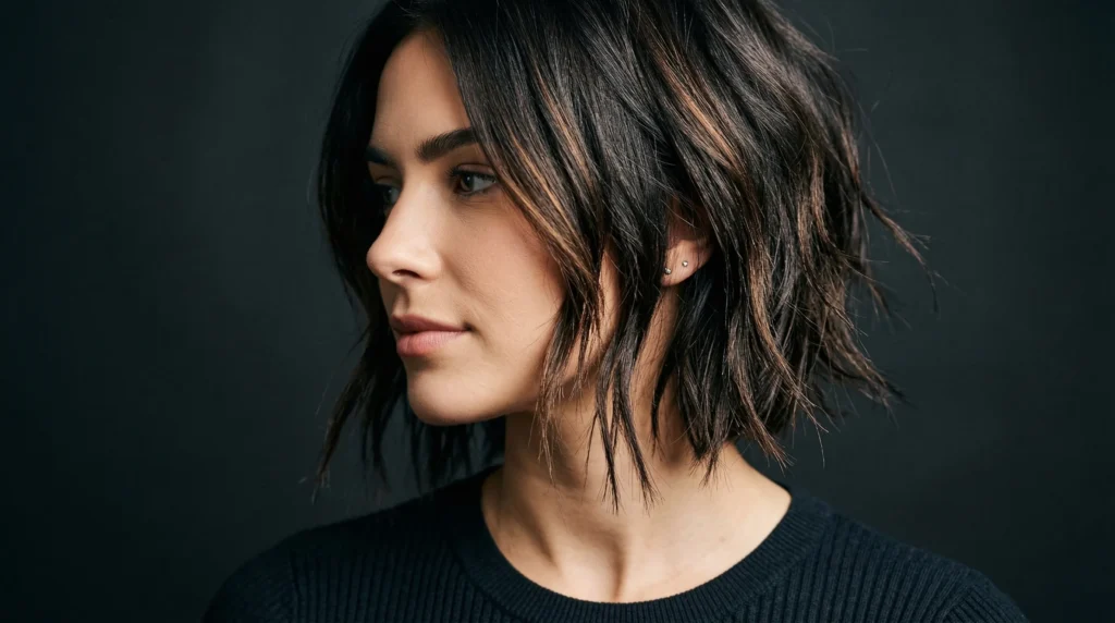 What I love about this cut is how much personality it adds without a dramatic length change. It’s also surprisingly low-commitment; the textured ends grow out softly, so you’re not on a six-week timer the way you are with a blunt bob. Pair it with slate blue gray or gothic brunette for a genuinely standout winter look.