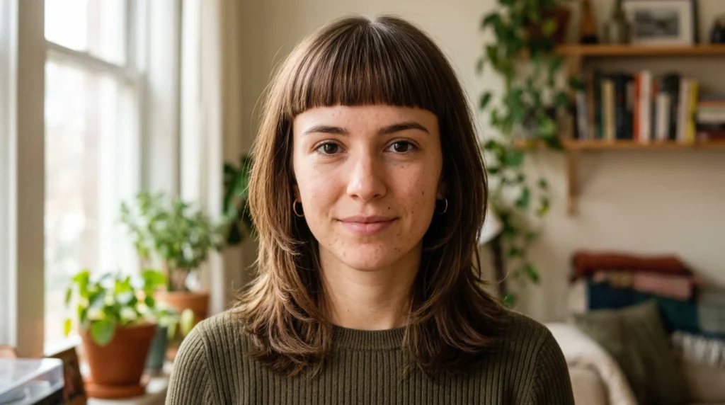 Bangs are making a significant comeback this winter, and the blunt bang with layers is the most wearable version. Unlike micro bangs or wispy fringe, blunt bangs have a clean, confident edge that looks intentional and modern when paired with medium-length layers.