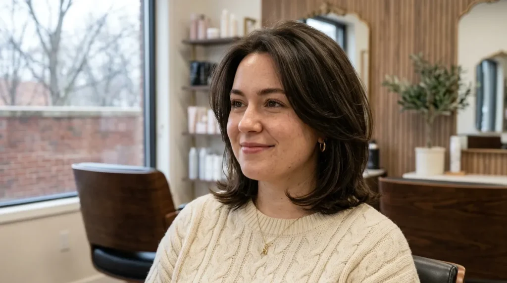 Butterfly layers are having their moment in winter 2025–2026, and they’re absolutely brilliant for round faces. The butterfly cut features longer layers at the front that frame the face, with shorter layers building volume through the mid-section. The effect is a slight ‘lift’ around the cheekbones that makes the face look higher and more defined — two qualities that are incredibly flattering on rounder face shapes.