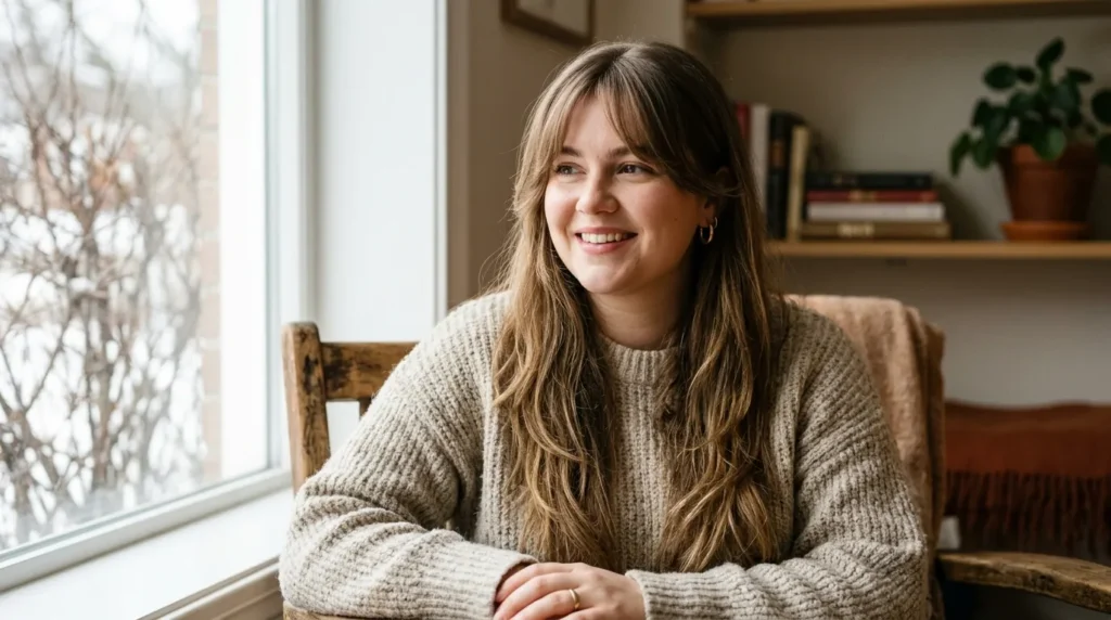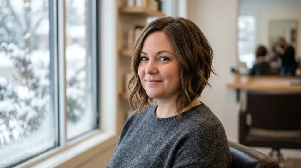 What I love about this specific style is its incredible versatility. On a cold winter morning when you don’t have time to style, scrunch in some sea salt spray and let it air dry — it’ll look intentionally undone and beautiful. On days when you want a polished look, a large-barrel curling iron and a little shine serum transforms it completely. It’s truly one of the most wearable winter haircuts for round faces 2025-2026 trendy looks on this entire list.