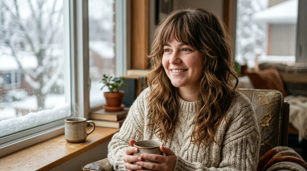 What makes this different from a regular shag is the intentional softness. The layers aren’t choppy or heavy — they’re wispy and blended, giving the overall look a delicate, slightly romantic quality that fits perfectly with the cozy, layered aesthetic of winter 2025–2026. In my experience, this cut is especially gorgeous on wavy or lightly curly hair, where the feathered layers lean into the natural texture and create that effortless, barely-styled finish that’s so in right now.