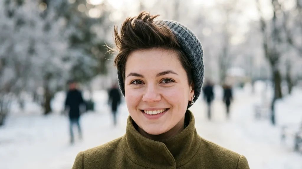The 2025–2026 version of the pixie isn’t the severe, closely-cropped cut of the past. It’s softer, with textured, feathery layers on top and a more relaxed finish around the ears and nape. You might be wondering if it’ll work under winter hats — and the answer is yes. A pixie actually looks very intentional when you take a hat off, unlike longer styles that tend to go flat. This is one of the bolder winter haircuts for round faces, but the payoff is real.
