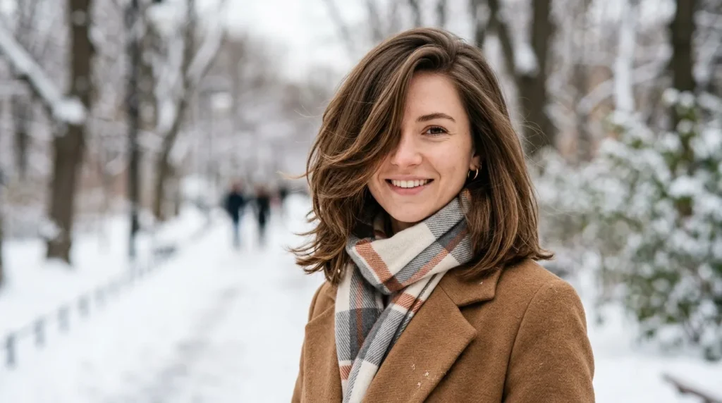 The side-swept layered lob is hands-down one of the most flattering winter haircuts for round faces you can try. The lob length (collarbone to shoulder) is already great for elongating, but the real magic is in the side-swept styling. When your hair falls diagonally across your face, it breaks up the roundness and draws the eye downward, creating the appearance of a longer, slimmer face shape.