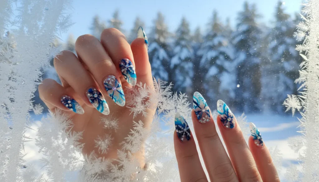 Clear or barely-there pink base nails with icy blue and white snowflakes creating an intricate frozen pattern. The snowflakes are bold, detailed, and absolutely eye-catching.