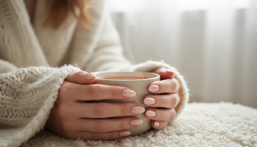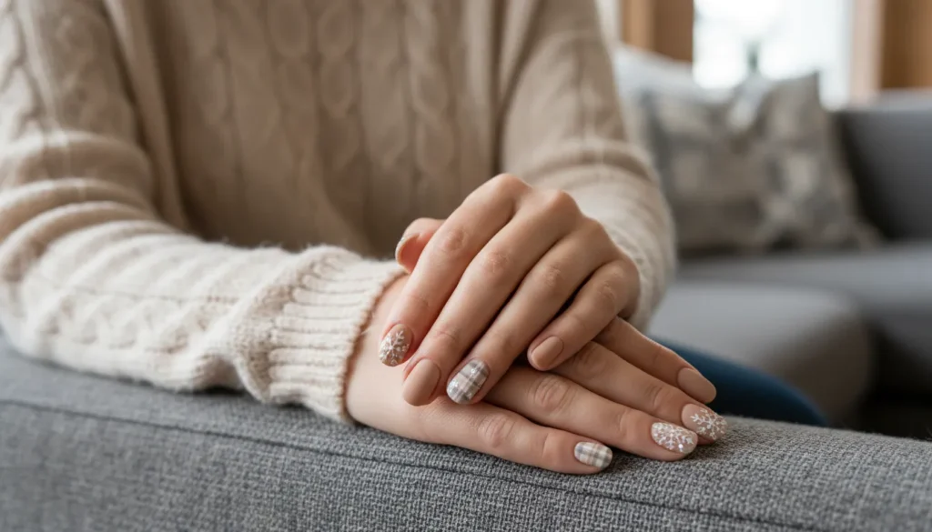 Soft beige, cream, or greige colors create a calm, elegant base. Add that sweater knit texture we talked about earlier, incorporate subtle snowflakes, and maybe add a hint of plaid on an accent nail for extra coziness.