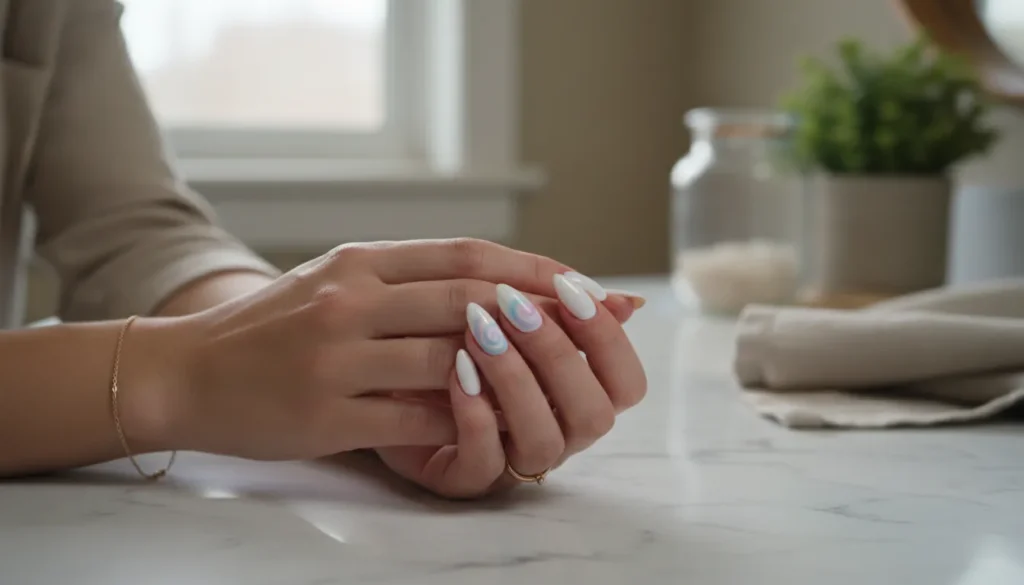 Picture this: clean, milky white nails with soft pastel swirls on one or two accent nails. The swirls look almost watercolor-like, creating this dreamy, ethereal effect that’s perfect for winter without being obviously seasonal.