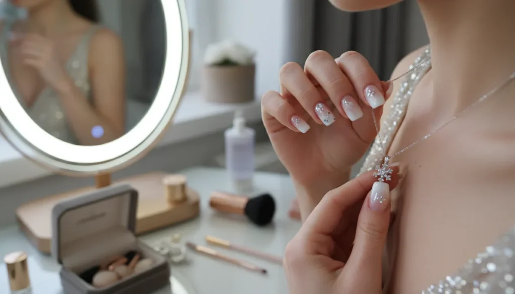 Soft white or pearly gradient nails create an ethereal base. Add tiny rhinestones along the cuticle line or placed delicately near the tip. Include one or two subtle snowflake designs. The result? Elegant, wintry, and just a little bit glam.