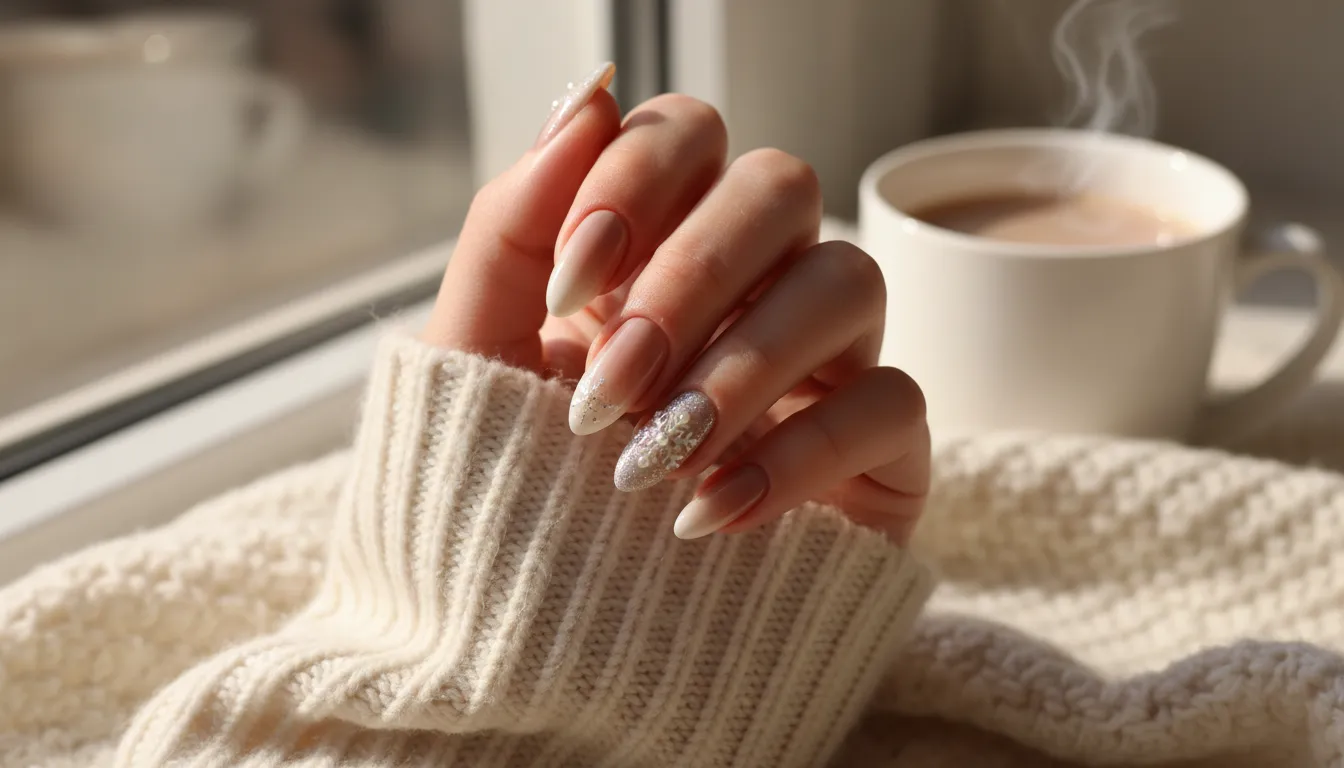 The overall vibe this season? Soft French tips, cozy neutrals, and delicate details that feel intentional rather than overdone. Perfect for subtle winter style with just a touch of magic.