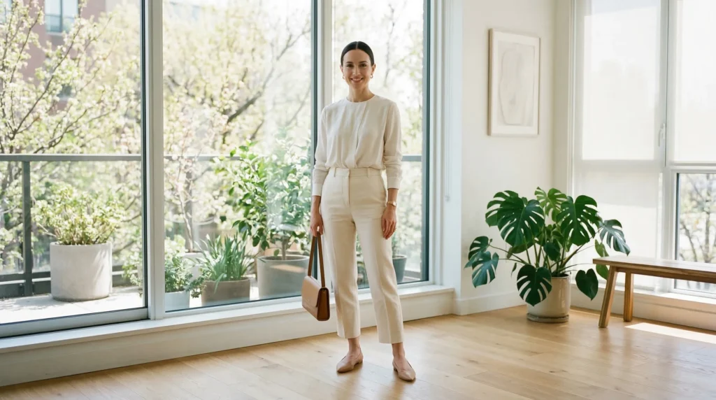 Simple shoes and understated jewelry keep the focus on the clean lines and fit — because that’s where the work is done here. Well-fitting tailored trousers and a quality blouse don’t need embellishment. To build on this further in the capsule, add a second blouse in a slightly different tone — soft blush alongside warm ivory, for example — and you have the same outfit formula in two different color moods.