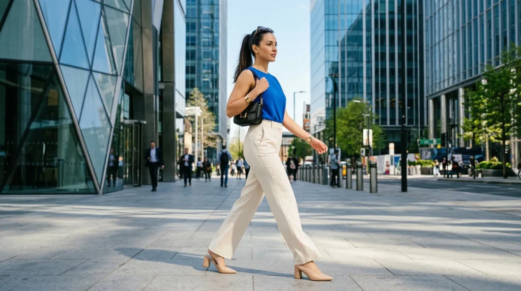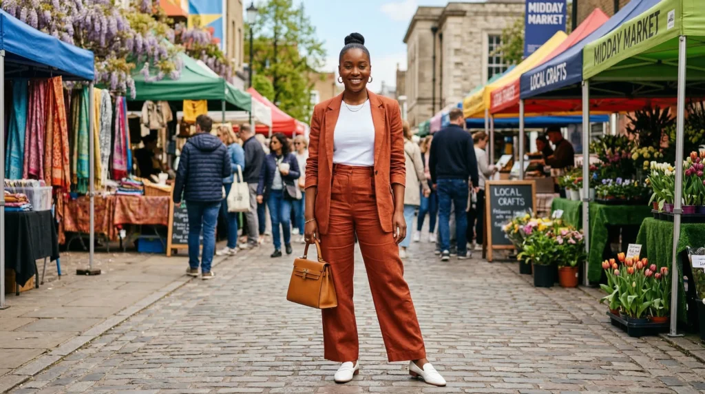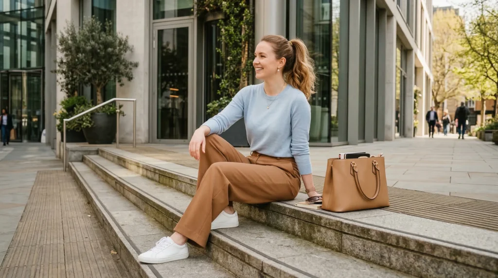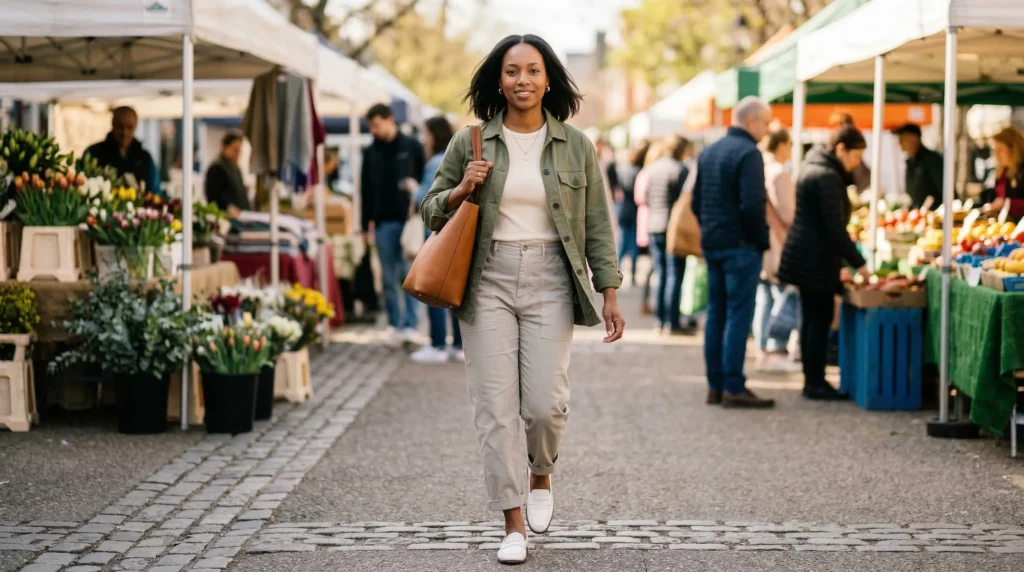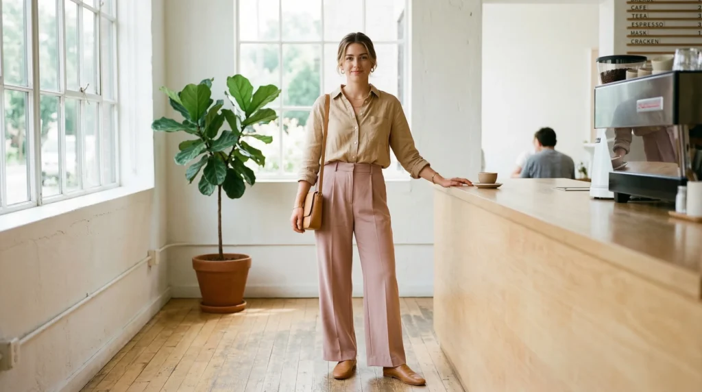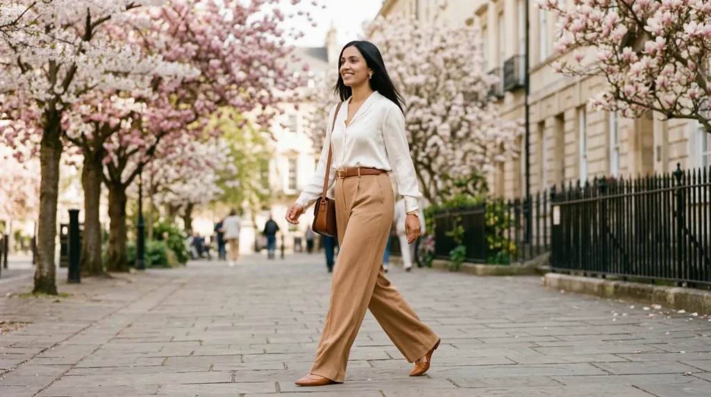 Simple ankle boots or loafers ground the look and make it practical for real days rather than just styled moments. In my experience, this is one of those outfits that photographs beautifully because the pieces don’t fight each other. Stylists often call this ‘a look that moves well’ — meaning it looks as good in motion as it does standing still. For spring 2026 modern outfits, that quality matters.