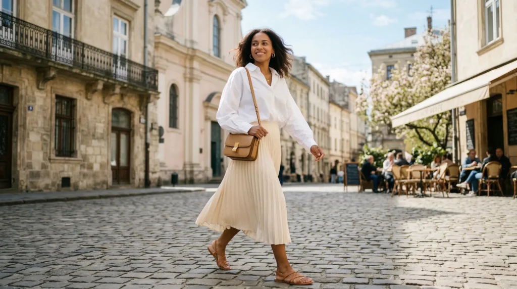 Now here’s where it gets interesting: the 2026 spring wardrobe is less about what’s new and more about how pieces connect. A silky blouse that works with tailored trousers and with a midi skirt. A bold knit that works with denim and with wide-leg trousers. A crisp white shirt that goes with everything. That kind of thinking is what builds a capsule that actually gets worn.