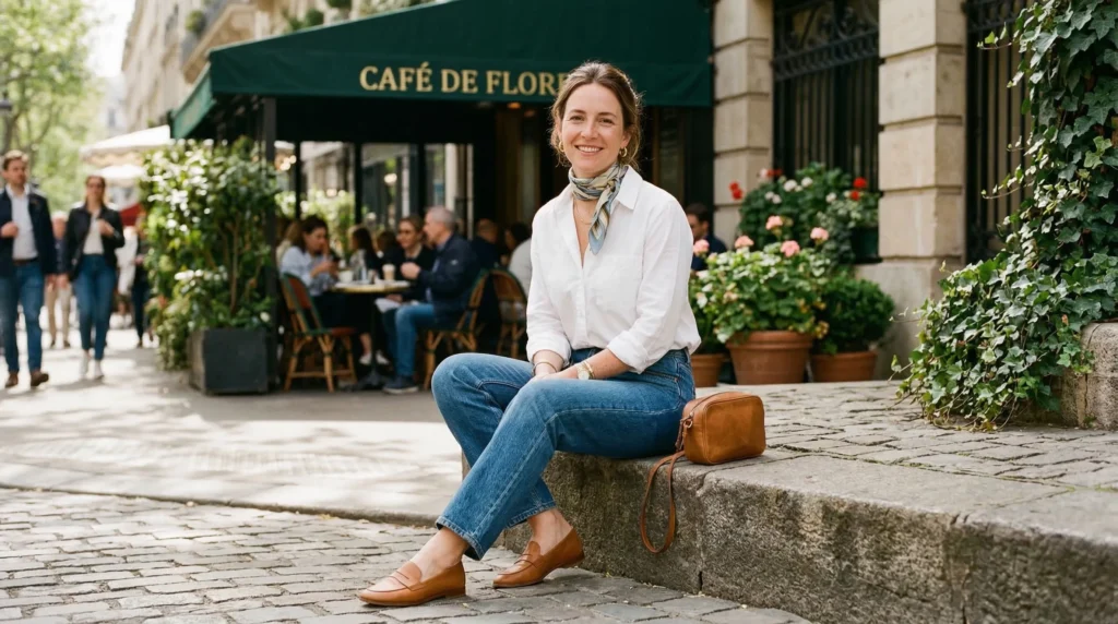 This look taps into that effortless, Parisian-style ease that never really goes out of fashion. A crisp white or pale blue button-down shirt — slightly relaxed in the fit, clean in its construction — paired with straight-leg or slightly relaxed denim in a classic mid-wash. Half-tucked at the front. A small silk scarf tied around the neck or at the bag handle. Thoughtful accessories that add personality without effort.