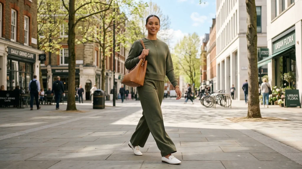 Closing the spring capsule wardrobe 2026 with a look that proves comfort and style aren’t opposing forces. A coordinated sporty set — matching trousers and top with clean lines and modern detailing — in a calm neutral like olive, warm stone, or soft ivory. Structured accessories keep the sporty undertone polished rather than casual. The result feels effortless and completely intentional at the same time.