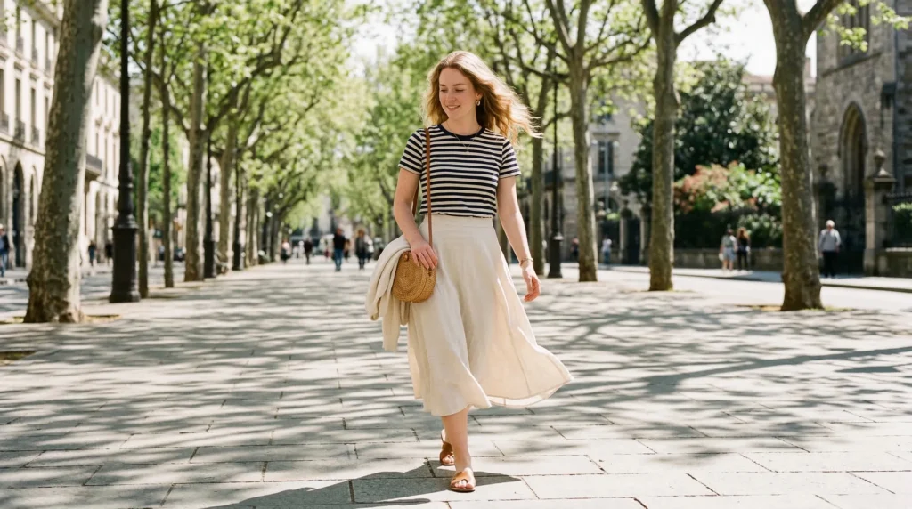 Don’t overthink this one. A classic striped tee — navy and cream, or black and white — paired with a flowing midi skirt in a solid neutral or soft floral. It’s timeless, it’s fresh, and it’s one of those combinations that genuinely works across nearly every lifestyle and setting. Playful, but it still has structure. Casual, but it doesn’t look careless.