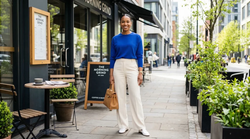 Now here’s where it gets interesting: this combination travels extraordinarily well through the day. You put it on in the morning for a meeting, wear it through lunch, and it still looks fresh by late afternoon. The saturated color top picks up light throughout the day in a way that neutrals don’t, which means the outfit actually looks better as the day progresses rather than worse.