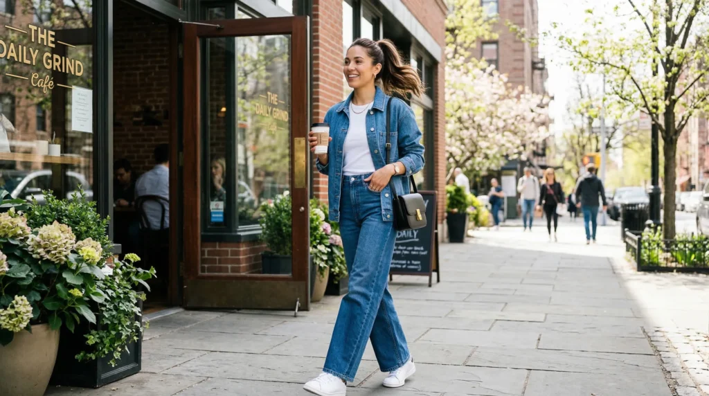 Denim has fully reclaimed its place in the spring 2026 capsule wardrobe — but the attitude has shifted. It’s not casual denim anymore. It’s considered denim. A structured denim jacket in a medium wash paired with wide-leg or straight-leg jeans in a complementary or slightly different wash. The silhouette is strong, the proportions are intentional, and the overall effect is unmistakably adult.