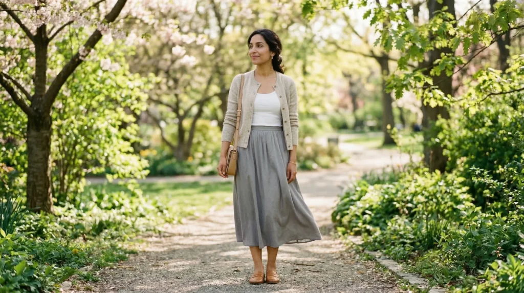 This look speaks quietly and that’s exactly what makes it compelling. A fitted cardigan — worn buttoned or open depending on the day — paired with a fluid midi skirt in a soft neutral or muted floral. The silhouette is timeless in the best possible way. Not dated. Not trying too hard. Just genuinely elegant in a way that doesn’t ask for attention.