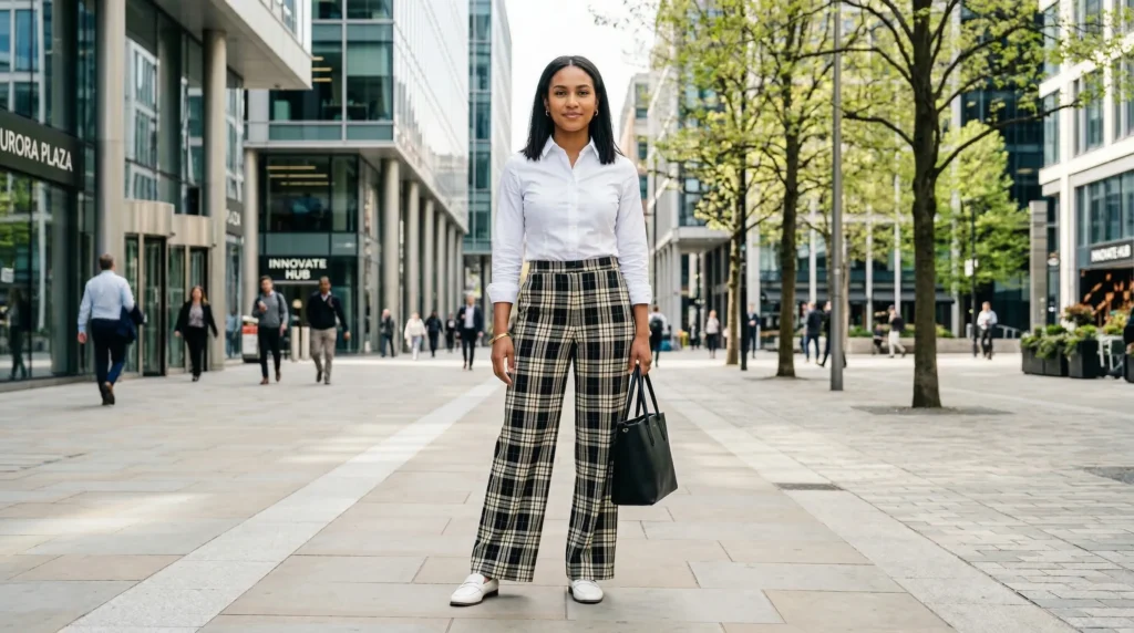 Sometimes the simplest combinations carry the most personality. A clean white tee or crisp white shirt paired with bold patterned trousers — plaid, wide stripe, graphic check, or abstract print. The contrast is immediate and effective. The white anchors the look and stops the pattern from feeling overwhelming. The pattern does the personality work. Together, it’s a modern spring outfit that looks intentional without trying hard.